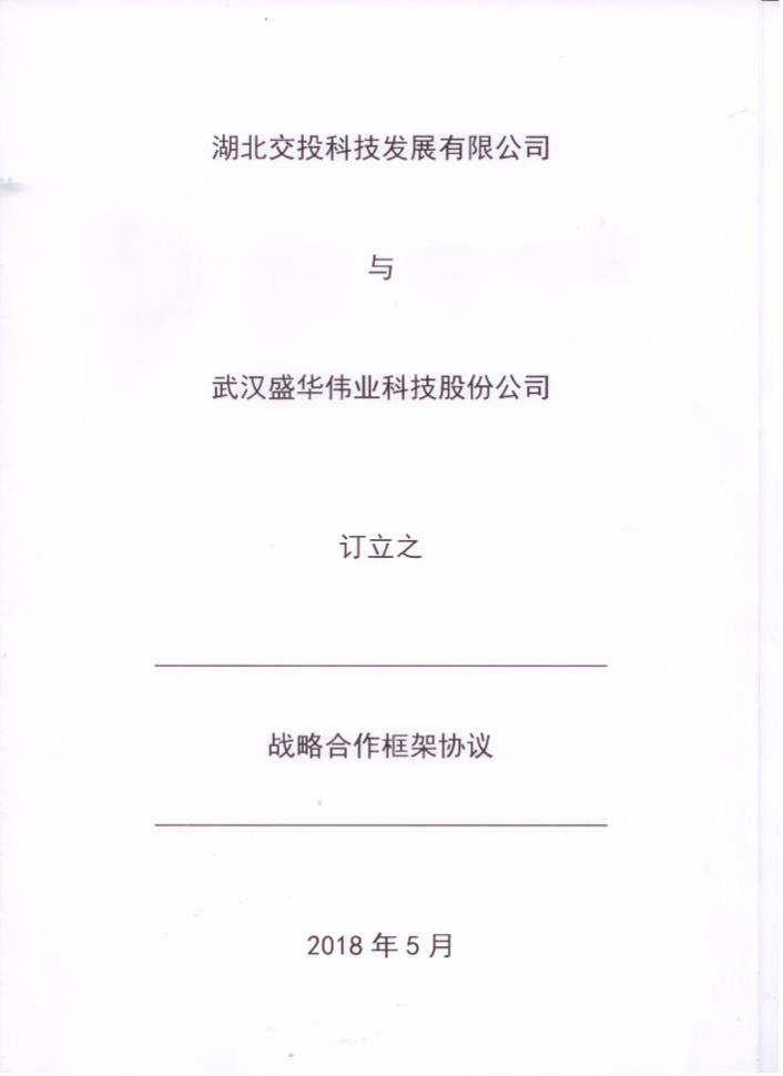 發(fā)布:2018-05-23 點(diǎn)擊:9982018年5月 與湖北交投科技發(fā)展有限公司簽訂《戰(zhàn)略合作框架協(xié)議》 武漢盛華偉業(yè)科技股份有限公司與湖北交投科技發(fā)展有限公司本著優(yōu)勢(shì)互補(bǔ)、合作發(fā)展,雙方就交通行業(yè)信息化建設(shè)領(lǐng)域的合作達(dá)成共識(shí),建立長期戰(zhàn)略合作伙伴關(guān)系。