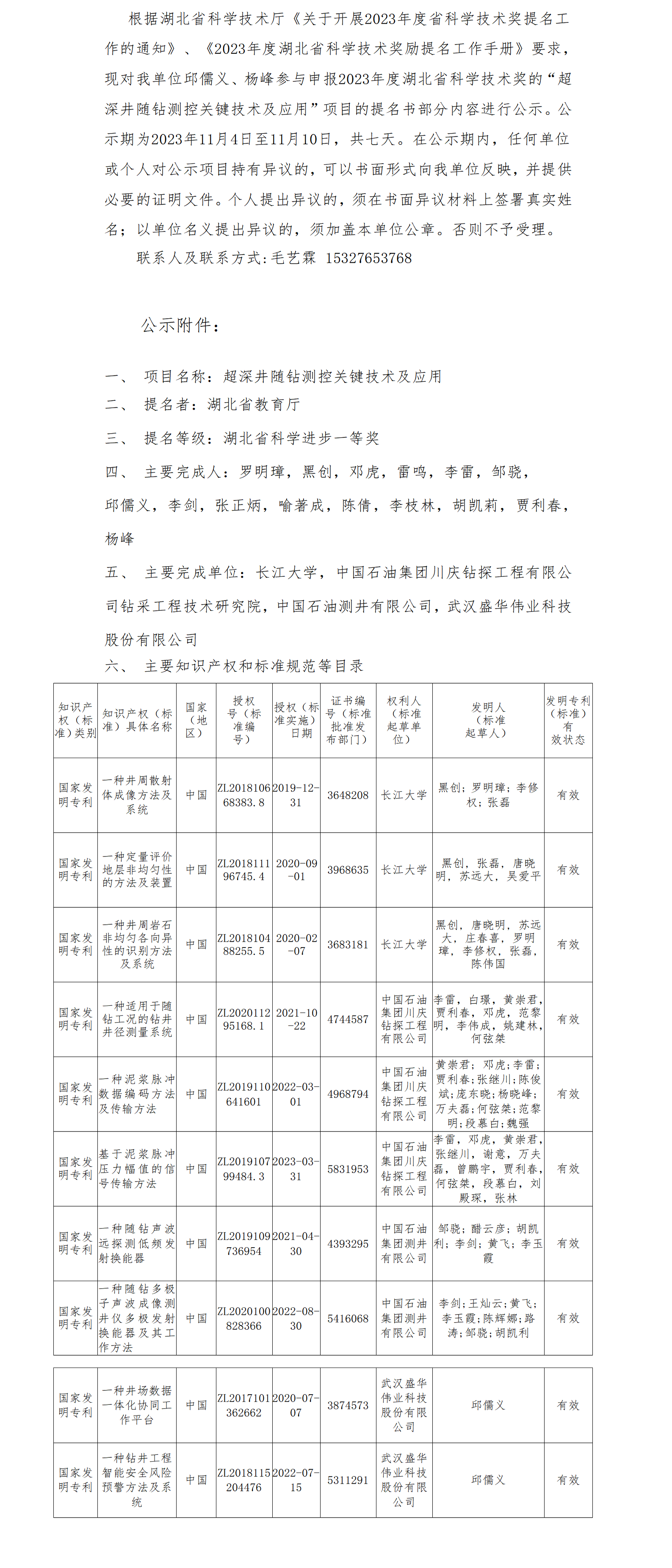關于我單位邱儒義、楊峰參與申報2023年度湖北省科學技術獎項目的公示